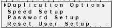 • Duplication Options : Allows you to set system behavior e.g.(Compare on or off, Burn CD on or off, etc…) • Speed Setup: Allows you to program the speed at which your drives will read or write. • Password Setup: Use to program password access to the setup settings and/or general operation. (Use extreme caution) • Reset User Setup: Use to reset to default system settings