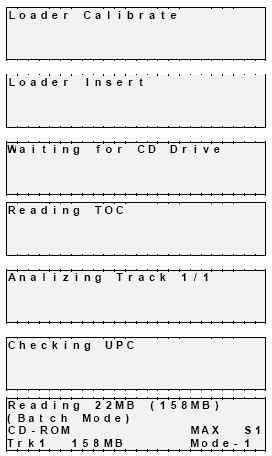 | When working with audio (CD-DA), mixed mode, or CD-Extra discs, additional screens indicating the presence of sub-indexes and ISRC codes may also be displayed. Progress will be displayed on the screen during hard disk image creation: