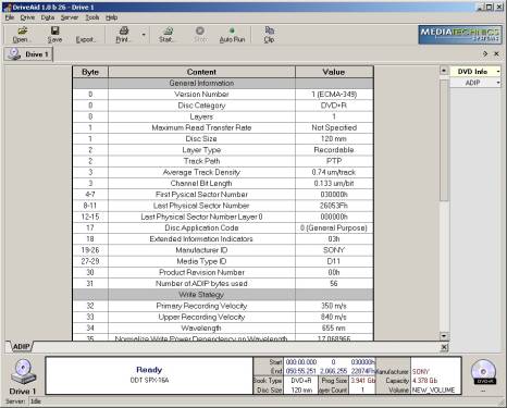 DISC ADIP – the ADIP information on a DVD Recordable disc can be shown in formatted mode by clicking on the ADIP button under the DVDinfo icon button that will appear in the listing on the right hand side of the screen. The initialization of a DVD+R or DVD-R disc will show blank media logic regardless of the information contained in the data field of the disc. If the Media is blank and contains no information in the data field then the Start operation is not highlighted. No blank media analysis is available in this version.