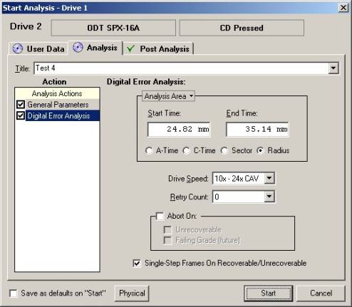 Analysis Area – choose the start and end time of the test. This can be defined by using A-time, Track time or C-Time, Sectors, or Radial position. The radial position mode may be used to monitor the physical position of a flaw. It also adds a third axis to the error graphics.