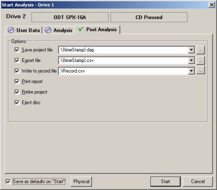 Post Analysis Options Tab – automated testing options and file saving paths. The are 6 defined operations that can be checked on or off in the Post Analysis Screen.