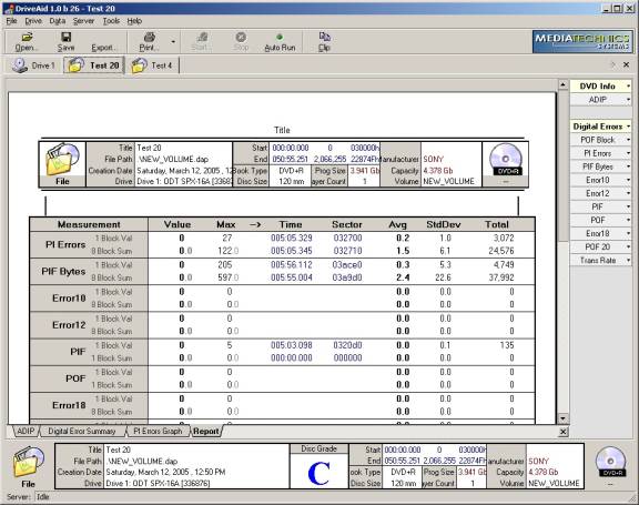 DVD print report – will provide a single page with the file header, the disc ID header, a media header, the test error summary and a PI error graphic .